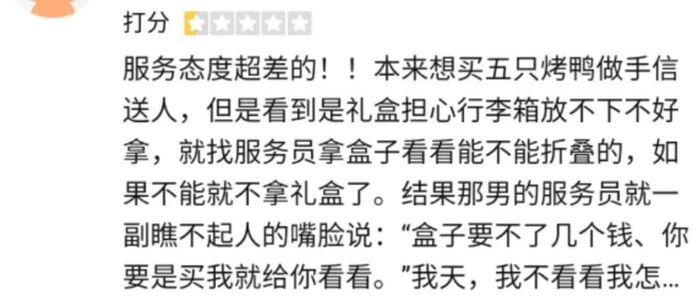 让食客失望的不只是价格,还有不到位的服务。有食客吐槽自己想要几个盒子装烤鸭,结果服务人员回复:“盒子要不了几个钱,你要是买我就给你看看。”就是这样的服务,还要收取10%甚至以上的服务费,食客自然是不会买账的。