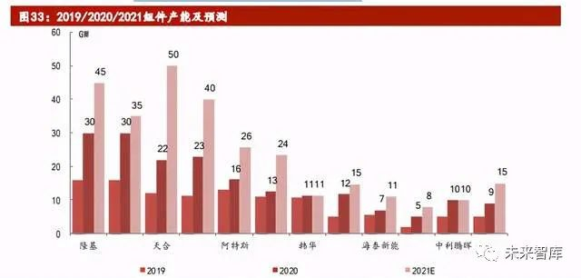 2020 年以来,头部电池片厂商扩产加速,通威、爱旭、隆基、晶澳、天合前 5 家 电池片产能均有显著提升。其中通威与爱旭作为专业化电池片厂商, 2020 年底 产能已达约 30、36GW,2021 年有望进一步提升至 42、40GW,位列全球第一、二 位,专业化电池片厂商龙头地位进一步稳固。
