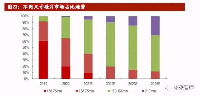 大尺寸电池发展已成为大势所趋。大尺寸电池可以有效提高组件发电功率,降低 光伏发电系统成本。当电池片面积增加时,每块电池的输出功率也随之增加。166mm电池比常规的156.75mm电池面积增加12.21%,210mm电池比156.75mm电池面 积增加80.5%。通过使用更大面积的电池,可以降低光伏发电的系统成本,获得 更高的光伏发电项目投资回报率。