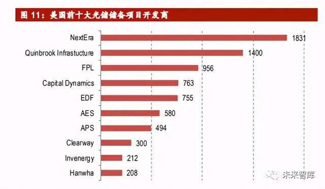 光储结合模式兴起,发展前景广阔。受光伏发电时间性和波动性影响,光伏+储 能这一最优结合模式开始在美国兴起。光储结合一方面可平滑光伏发电波动性对 电网系统的冲击,一方面可以将发电余量自用。此外,投资税收抵免政策也从侧 面支持了该模式发展。彭博新能源财经数据,当前光储一体化项中,电池部分约 24GWh,前十大开发商占比约 31%。Wood Mackenzie 预测,到 2025 年,美国大约 30%的非住宅光伏发电容量将来自社区太阳能,并且预计每四个非住宅太阳能系 统中将有一个安装储能。