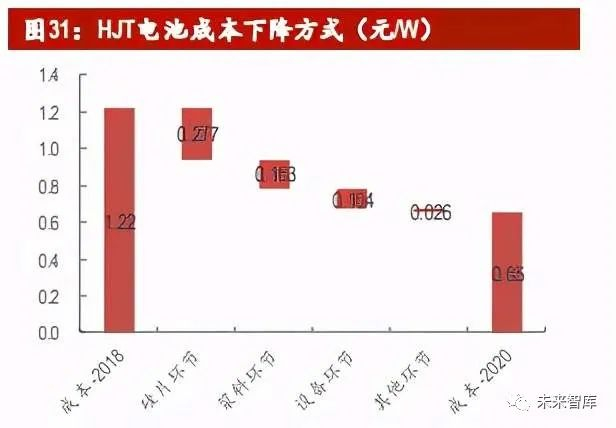 虽然HJT制造工艺与PERC不同,需要重新投资新设备及新辅材,但随着设备及辅 材国产化不断突破,未来HJT降本空间巨大。目前主流的异质结电池采用晶硅衬 底和非晶硅薄膜构成,主要工艺是先将N型硅片清洗制绒作为衬底,经过非晶硅 薄膜沉积与TCO导电膜沉积,并通过丝网印刷制备银电极,最后烧结退火制成。从成本端看,HJT与PERC在制造工艺与生产设备最大不同之处在于非晶硅薄膜沉 积与导电膜沉积环节。非晶硅薄膜沉积所需设备PECVD目前主要依靠进口,单GW 设备投资额在5亿元左右,国内设备厂商钧石、理想已有相应产品推出,迈为股 份与捷佳伟创也在积极研发。设备国产化有望显著降低HJT产线的投资成本。此 外,HJT制作原料所需的低温银浆和靶材国产化研发顺利,低温工艺还为硅片薄 片化提供可能,出片率提升可有效降低硅料成本。