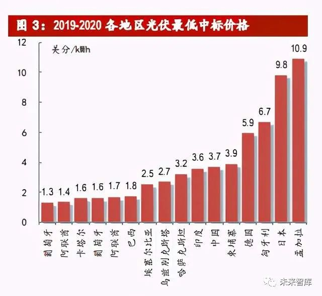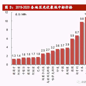 装机成本持续下行,平价市场逐步打开。近年来,光伏技术进步使得装机成本不 断下行,带动光伏发电性价比提升,全球平价市场正在逐步扩大。总结近期各地 区光伏最低中标价格,2020 年葡萄牙光伏项目最低中标电价已达 1.32 美分/kWh, 再创光伏发电最低中标电价纪录,光伏发电已经成为越来越多国家成本最低的能 源发电方式。