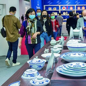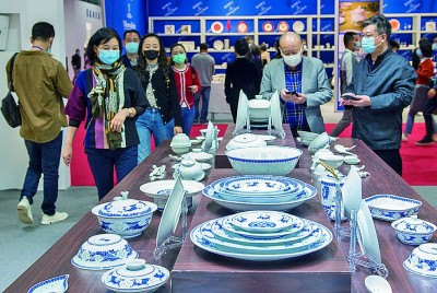 2020年10月18日,参观者在江西景德镇举办的第17届中国景德镇国际陶瓷博览会上观看陶瓷展品。胡敦煌摄/光明图片