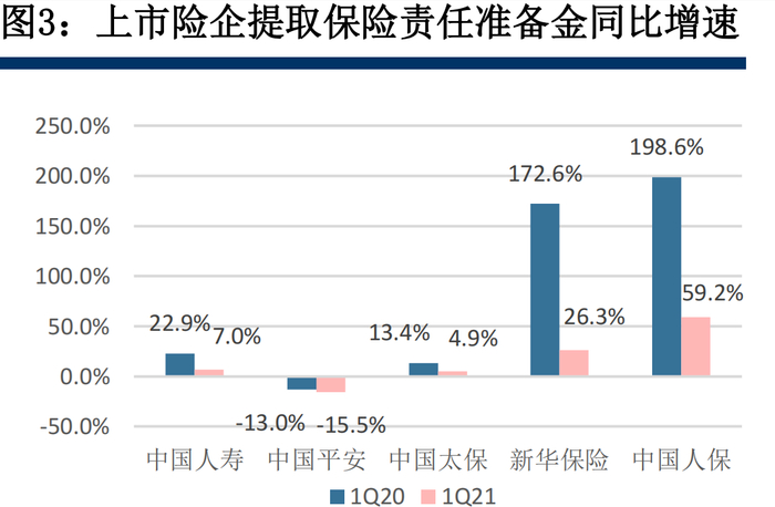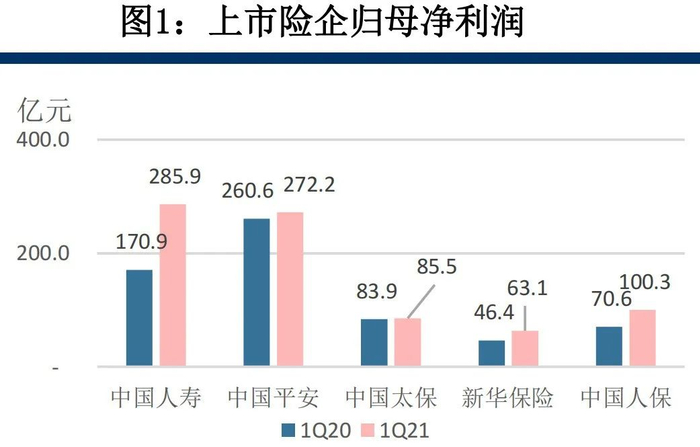 1Q21上市险企净资产收益率承压:国寿4.1%(yoy-0.2pt)>太保3.9%(yoy-0.3pt)>平安3.5%(yoy-0.1pt)。