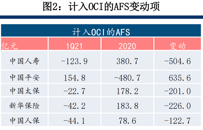 考虑计入OCI的AFS变动情况,主要上市险企测算综合投资收益率1Q21排序:新华6.1%(yoy+1.8pt)>国寿5.2%(yoy+1.3pt)>平安5.1%(yoy+4.1pt)>太保4.2%(-0.1pt)。虽然平安减值华夏幸福,但综合投资收益率依然超过评估假设,亦将获得利差益。
