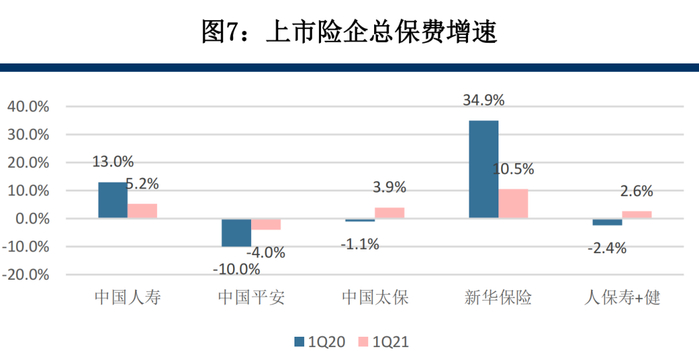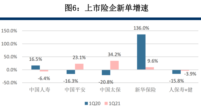 上市险企1Q21新单增速排序:太保(yoy+34.2%)>平安(yoy+23.1%)>新华(yoy+9.6%)>人保寿+健(yoy-3.9%)>国寿(yoy-6.4%)。受上年高新单增速的影响,国寿、新华续期增速领先,带动总保费增速表现优于新单,平安、太保总保费增速有所承压。上市险企1Q21总保费增速排序:新华(yoy+10.5%)>国寿(yoy+5.2%)>太保(yoy+3.9%)>人保寿+健(yoy+2.6%)>平安(yoy-4.0%)。