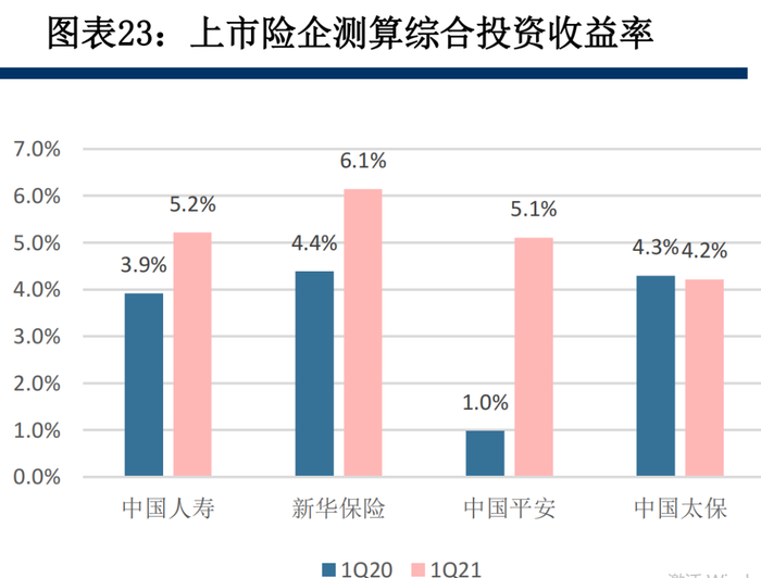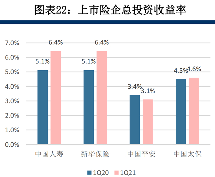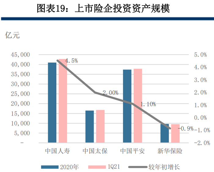 受保费增长的牵引,扣除当期赔付及退保后,1Q21上市险企投资资产规模普遍较年初有所提升:国寿(4.5%)>太保(2.0%)>平安(1.1%) >新华(-0.9%)。