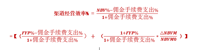 新业务价值投入产出比(NBV/佣金手续费支出)体现渠道经营效率,而该值的变动幅度可衡量渠道改革进展及经营变化。因NBV=FYP*NBVM,渠道经营效率增速可进一步分解为:
