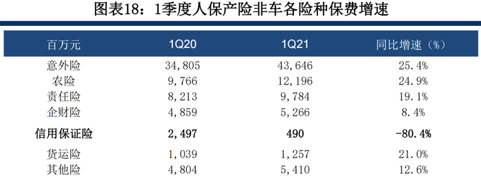 产险:车险综改、龙头险企综合成本率边际改善,其中:平安产险(yoy+95.2%)、人保财险(yoy+95.7%),较去年同期分别-1.3pps、-1.4ppt,预计优于行业。1Q21人保车险综合成本率仅94.6%,业务品质优良;随着信保风险逐步出清,整体综合成本率将进一步优化,人保产险年内业绩有望“量价”齐升。