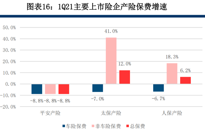 非车增速有所分化:太保(yoy+41.0%)>人保(18.3%)>平安(-8.8%)。在非车的高增速带动下,太保产险保费增速领跑行业,总保费收入排序:太保产险(yoy+12.0%)>人保财险(yoy+6.2%)>平安产险(yoy-8.8%)。
