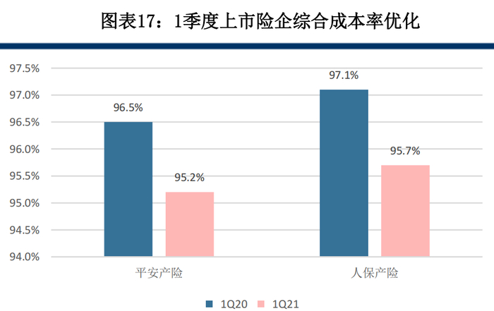 车险综改优于预期,盈利能力进一步增强:1)保费承压,但缺口收窄:自上年9月实施车险综合化改革以来,受件均保费下降的拖累,上市险企车险保费依然承压。人保产险4Q20车险保费承压(yoy-10.0%),因上年疫情影响拉低1Q基数,1Q21车险保费增速缺口有所回暖(yoy-6.7%,QoQ+3.3pps)。2)综合成本率将优于行业,预计全年将继续保持承保盈利。A.价费联动机制对规模占比较高的家用车可实现承保盈利;B.自建续保团队(预计费用率远低于传统渠道)也进一步压降费用率、并可增强与客户的粘性,当前续保+直销团队保费占比已达到30%,随着渠道的逐步完善,也将进一步压降费用、实现承保盈利;C.通过送修资源匹配车商渠道,进一步控制赔付率、费用率。根据1Q业绩发布会,当前人保直销+直控模式保费占比已达60-70%,2020年公司已实现车险承保盈利88亿(高于行业),以保单年来看,今年车险新单的综合成本率将控制在98%以内,预计21年车险业务亦将实现盈利。