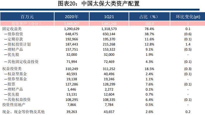 大类资产配置:普遍加大非标债权配置比例。年初至Q1,10年期国债收益率提升4.6bps至3.2%,长久期利率债资产配置窗口显现,为上市险企新单及到期再配置资产带来契机。而因长端利率高位震荡、信用风险有所暴露且考虑到短期通胀压力,上市险企普遍加大非标债权配置比例、提升整体收益。1)太保:截至1Q21,公司非标债权资产环比+0.9pt达到21.9%,尤其是债券投资计划(环比+1.4pt)。2)平安:截止1Q21,公司债权计划及债权型理财产品占比较年初上升0.8pt至11.8%。