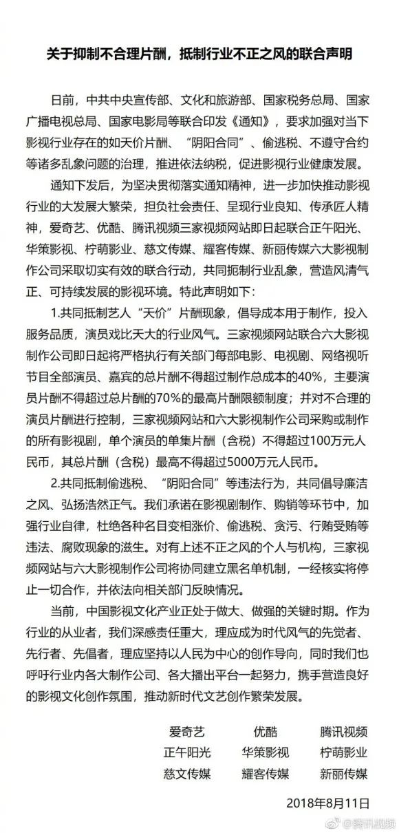2018年8月,“爱优腾”三家视频网站联合六家影视公司发布声明,明确演员的总片酬最高不得超过5000万元。此后又有消息称,明星参与综艺节目的薪酬也受到调控,“单期节目单人片酬不超过80万元,常驻嘉宾一季节目总片酬不超过1000万元”。