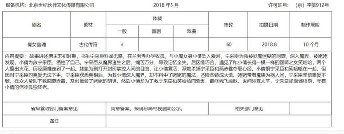 《倩女幽魂》(后改名为《只问今生恋沧溟》)备案信息