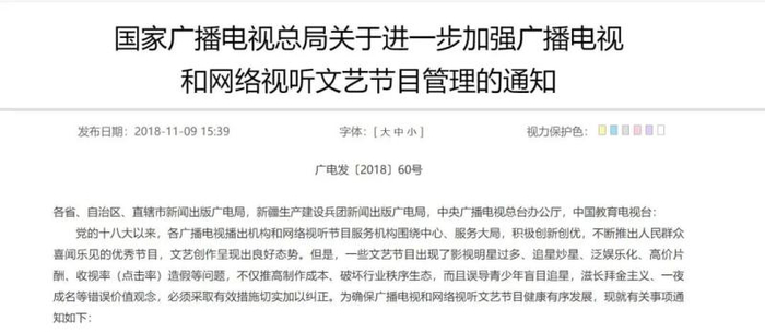 2018年11月,国家广播电视总局公布关于进一步加强广播电视和网络视听文艺节目管理的通知。