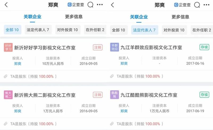 这段时间,郑爽也新开了不少工作室。企查查显示,2016年,她任法定代表人的两家工作室在江苏新沂开张,后于2018年注销;2017年,另外两家郑爽任法定代表人的工作室在江西九江成立,并存续至今。