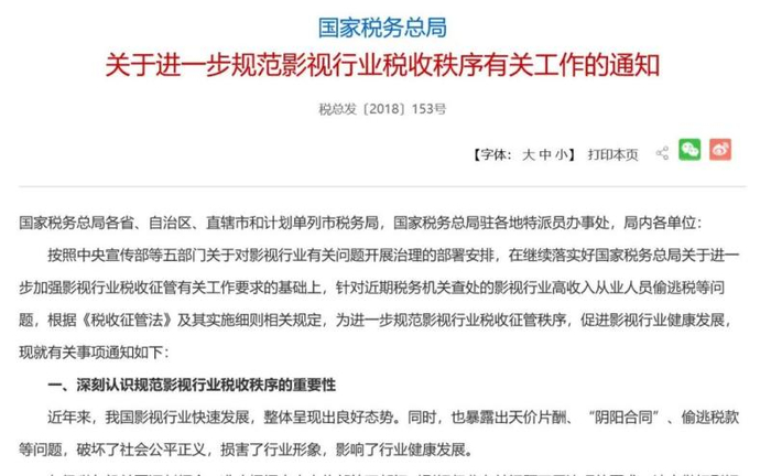 同年,国家税务总局发布《关于进一步规范影视行业税收秩序有关工作的通知》。其中提到,近年来,我国影视行业快速发展,整体呈现出良好态势。同时,也暴露出天价片酬、“阴阳合同”、偷逃税款等问题,破坏了社会公平正义,损害了行业形象,影响了行业健康发展。