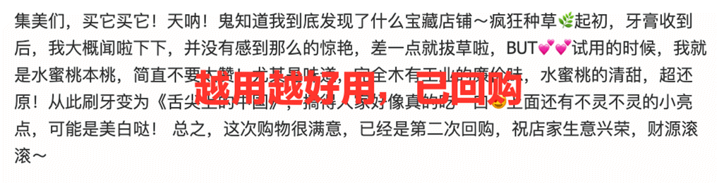 刷完牙后,口里就像吃了一只柔软果肉、酸甜汁水、诱人香味的新鲜水蜜桃。