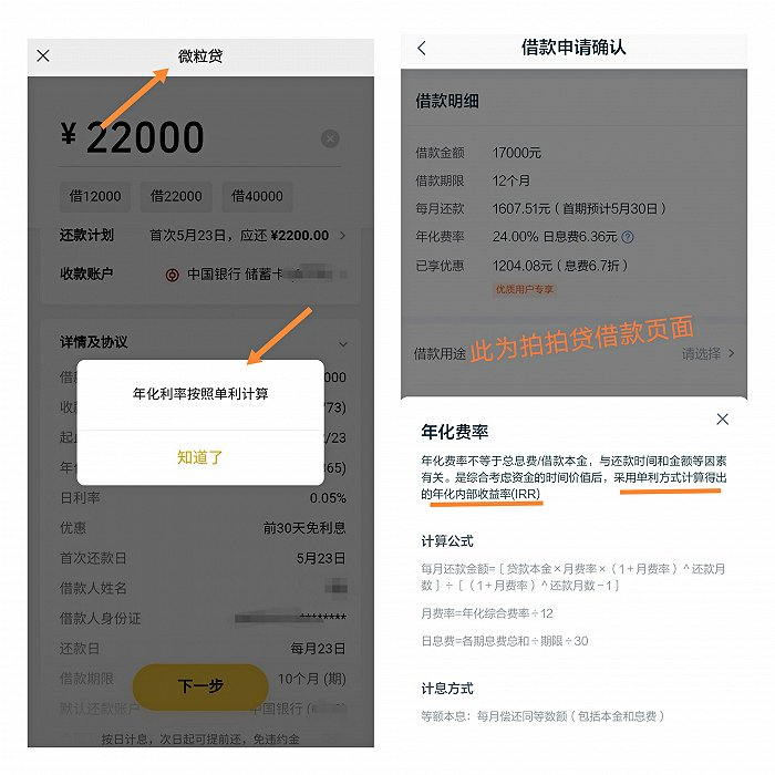 界面新闻记者发现,虽然多家贷款机构注明了年利率,但仍存在整改不到位的情形,如各家贷款机构普遍采用单利计算方式,且未按规定进行如实说明。在选取的测试对象中,仅微粒贷、拍拍贷借款在确认借款前分别注明了单利计算方式,其余均未说明。