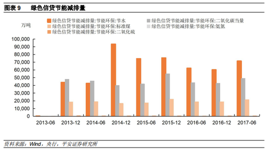 绿色信贷的稳步发展,对节能减排的贡献度逐步提高,根据银保监会统计,2017年6月,绿色信贷的二氧化碳、标准煤的减排量分别达到4.9亿吨、2.2亿吨,促进节水7.2亿吨。