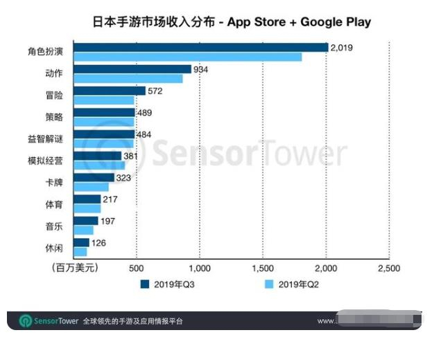 根据Sensor tower公布的《2019日本移动游戏市场调查报告》显示,在日本手游市场,不管是在收入上,还是在下载量上,适合中年人玩的角色扮演、益智解谜、音乐休闲都占据着主导地位。