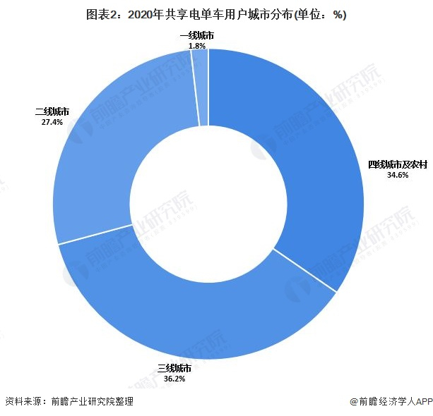 从共享电单车的用户分布来看,一线城市仅占1.8%,二线城市占据27.4%,三线城市占据36.2%,四线城市及农村的用户占比达到34.6%。在公共交通尚不完善的三四线城市,共享电单车用户众多。