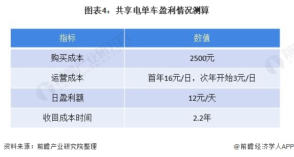 一台电单车的购买成本为2500元左右,除了每辆车的造价外,市面上大多共享单车都采取换电池模式,每辆共享电单车在电池产品、人力、运营的成本。第一年每辆电单车的日成本在16元,之后每年的日成本是3元,但后续共享电单车的使用寿命不断缩减,平摊下来共享电单车能否收支平衡还是个问题。