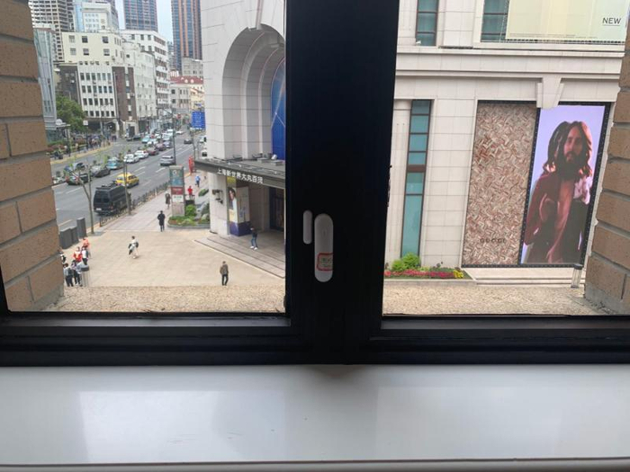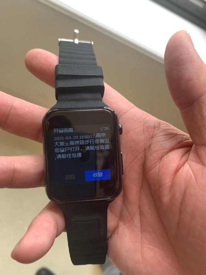 大楼三层,一位顾客被窗外的繁华景象所吸引,打开窗户将手机探出窗外拍照——这个平常不过的举动,有可能给节假日街上的人群带来高空坠物的隐患。安装在窗户上的传感器第一时间监测到了开窗行为,店内保安范天玉佩戴的智能手环立即接到了系统自动报警。他马上赶往现场处置,系统随即显示窗户关闭。
