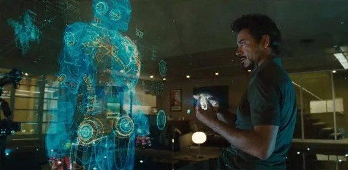 主人公托尼·史塔克在设计、修理自己的钢铁侠“战甲”时,并不是在实体的“战甲”前敲打焊接,而是直接在面前浮现出的虚拟影像上,通过手势指令,指挥一旁的机械手臂随之在实体铠甲上进行操作。