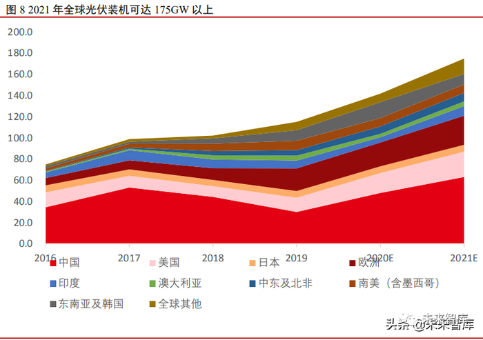 国外装机需求:尽管在 2021 年,全球光伏市场仍然面对疫情等不稳定因素,但按 照《巴黎协定》和全球可持续发展的要求,各国仍然把控制气候变化,发展光伏等清洁 能源放在重要位置,国外市场将呈现多点开花局面,预计 2021 年全球光伏装机增长将 达到 170-190GW。