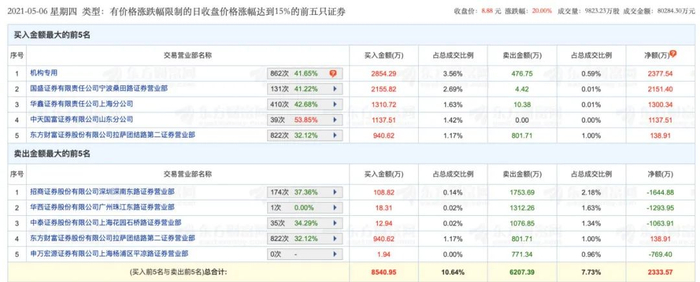 5月6日盘后龙虎榜显示,一机构净买入旗天科技2377.54万元。