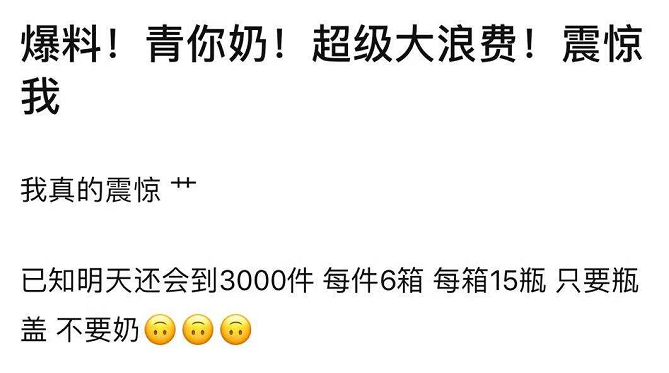 早在去年4月《青春有你2》期间,就有粉丝为了让自家偶像夺冠,自费买几十箱明星代言的牛奶,挨个打开,拧开瓶盖,瓶内的牛奶则大量倒掉。