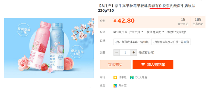 购买赞助《青春有你3》的商家的饮品,微信扫码瓶盖内二维码即可兑换为“果粒值”为参赛选手投票。这款乳制饮品,一瓶7.5元人民币,230毫升。