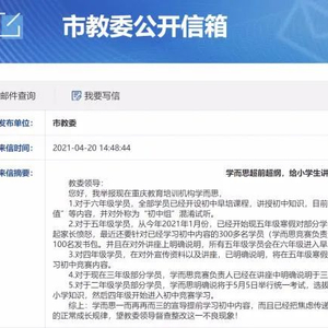 值得注意的是,今年4月20日,曾有人在重庆市教委网站公开投诉“学而思超前超纲,给小学生讲初中内容”,甚至“引起家长愤怒”。