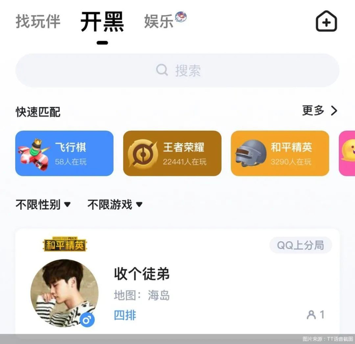 从业务层面看,TT语音已不只是一款游戏语音工具,这款应用首页的三大板块“找玩伴”“开黑”“娱乐”明确了TT语音现在的定位:游戏社交平台。