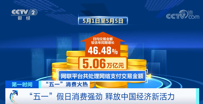 最新数据显示,“五一”假期,网联平台共处理网络支付交易金额5.06万亿元,日均交易金额较去年同期增长46.48%。银联网络交易金额达到1.91万亿元,日均交易金额较去年同期增长5.5%。两大支付清算平台日均交易金额均创历年同期新高。
