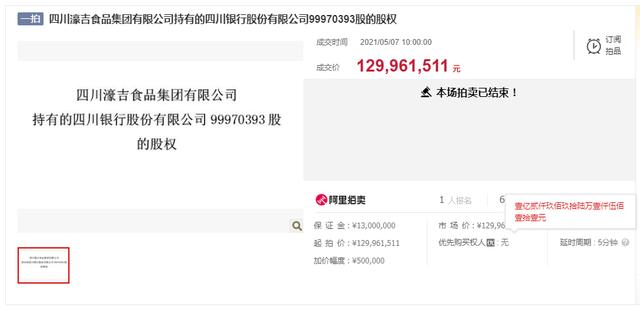 5月6日至5月7日,四川省成都市中级人民法院 在淘宝网司法拍卖网络平台,对四川濠吉食品集团有限公司(四川濠吉食品)持有的四川银行股份有限公司99970393股第一次拍卖,起拍价为12996.1511万元,折合每股起拍价约1.30元。