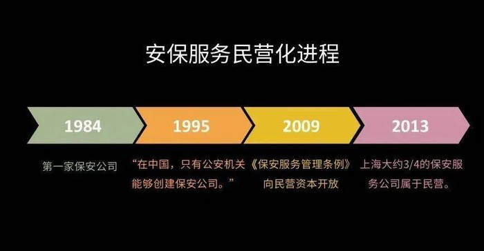 1995年的时候政府还在强调,只有公安机关能够创建保安公司,直到2009年的《保安服务管理条例》才向民营资本开放,其实之前已经有一些民营保安公司,但是量比较少。到2013年上海大约3/4的保安服务公司是属于民营的,现在这个比例肯定是大大增加了。