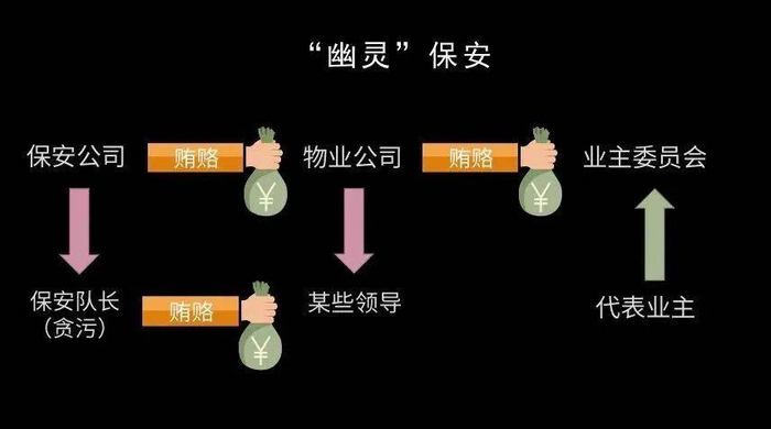 自从保安服务外包以后,贪腐现象其实更容易发生在这个系统中了,下面是有时候可能会发生的情况。保安公司为了拿下这个合同,它必须要贿赂物业公司,物业公司要签一个这么大金额的合同,它是需要业主委员会来批准的,它有时候就需要贿赂业主委员会。