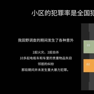 我在大地做田野调查的期间发生了一些事件,主要是有两起小型的火灾,两起自杀,十多起电瓶车和车里的贵重物品失窃,以及邻居的纠纷,但是那段时间并没有发生一些重大的暴力犯罪。