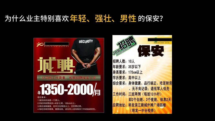 我不知道大家看过保安的招聘广告没有,绝大部分情况下第一条都是年龄,譬如左边那个是20到40岁之间,右边是35岁以下。第二条就是身高,左边是1米65以上,右边是1米75以上。