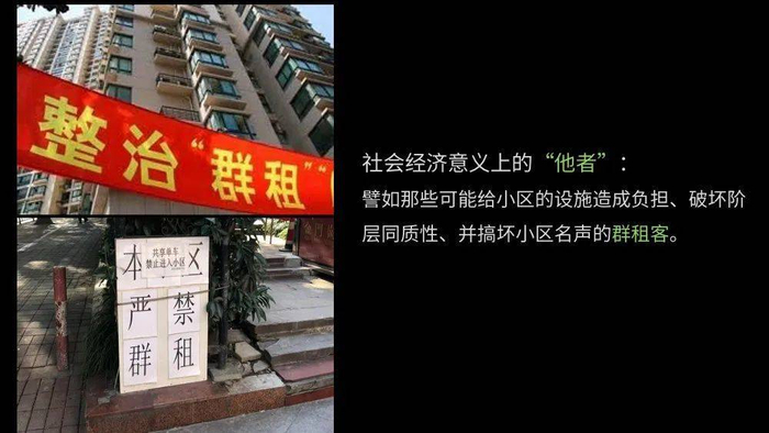 因此很容易理解,为什么中上产阶级业主特别厌恶那些社会经济意义上的“他者”,譬如那些可能给小区的设施造成负担、破坏阶层同质性、并搞坏小区名声的群租客。