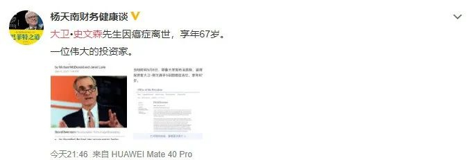 金石致远CEO杨天南转发了大卫·史文森离世的消息,并称其为“一位伟大的投资家”。