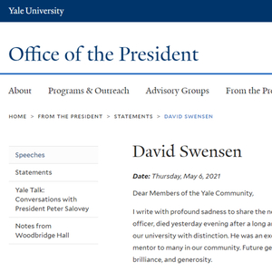 北京时间5月6日晚间,耶鲁大学以“纪念大卫·史文森”为题在其官网发布了悼念信,由现任校长苏必德(Peter Salovey)撰写。