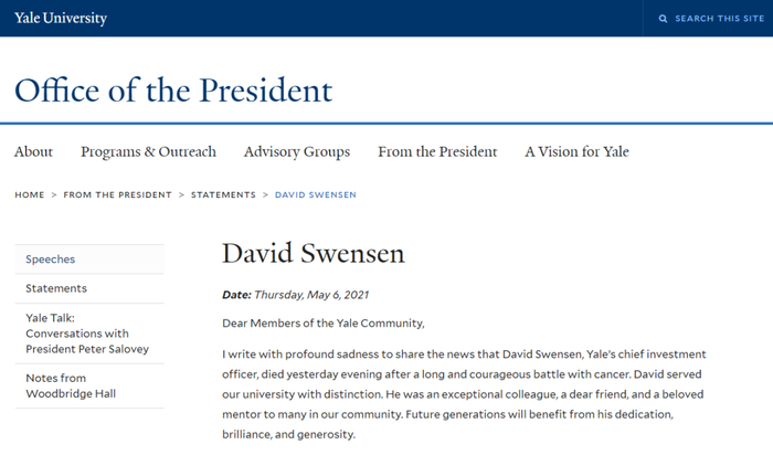 哀悼信中介绍了大卫·史文森的过往经历和成就。1980年获得耶鲁大学经济学博士学位后,大卫·史文森曾在所罗门兄弟公司和雷曼兄弟公司工作,1985年回到耶鲁领导学校的投资办公室。在他的指导下,耶鲁捐赠基金投资业绩斐然,使他成为机构投资者中的传奇人物。