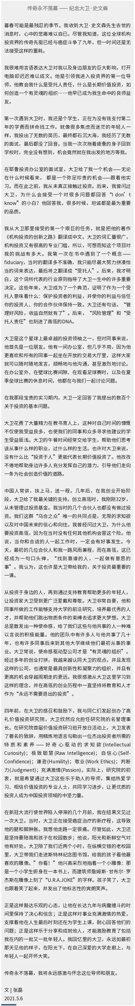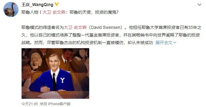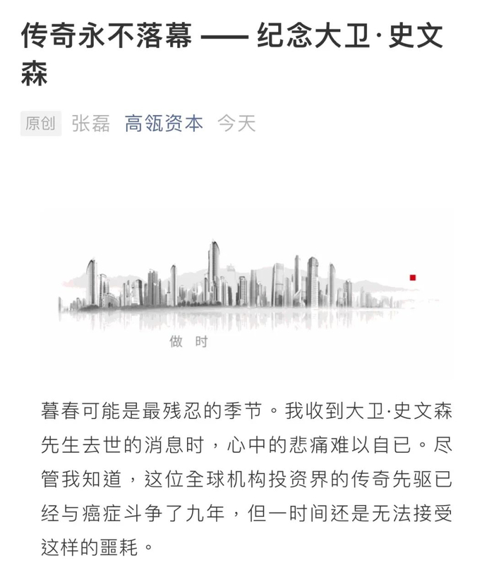 重阳投资总裁王庆则转发了有关大卫·史文森的一篇旧文,以表纪念。