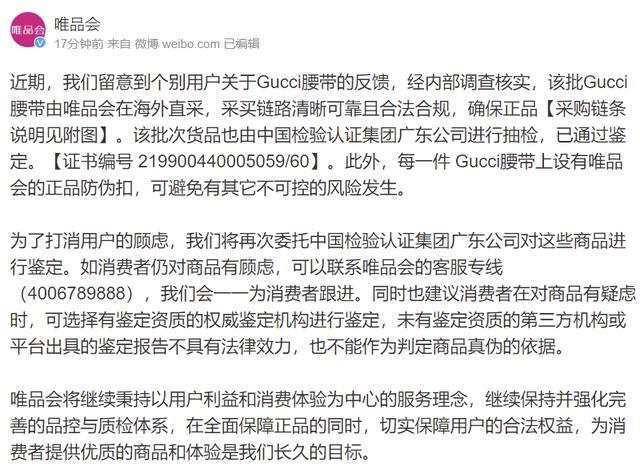 唯品会方面称,在第一时间启动了内部调查。已核实该批Gucci腰带由唯品会在海外直采,采买链路清晰可靠且合法合规,确保正品。