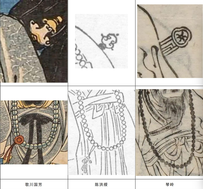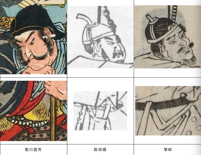 首先,歌川国芳对于《水浒叶子》的人物形象有直接的借鉴和挪用(如图14-15)。但是,日本学者乌松林认为,国芳的武松,从人物的刘海、头型、眼睛以及衣服褶皱纹理来看,都更像《玄同放言》中,琴岭绘制的版本,而非直接模仿明刻本中陈洪绶的水浒人物。但是笔者认为,从人物颈部念珠以及背负的武器细节来看,国芳的作品都更接近陈洪绶的原作(图16)。另外,从戴宗的人物形象来看,尽管人物腿部甲胄的描绘,国芳和琴岭更接近,但是仅仅一处纹样的相似并足以说明问题,人物的眉眼、腰间带饰等,国芳都更接近陈洪绶的原作(图17)。