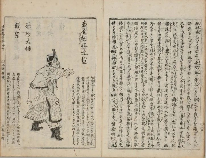 陈洪绶创作了不少版画作品,它们可能依托书籍传入日本,这可能是更值得关注的一条路径。“应是中国传记书籍和流行小说的插图,对江户时期的人物绘制产生了重要影响,而不是手卷。” 陈洪绶所创作的水浒题材白描人物版画——《水浒叶子》,最初有可能是通过书籍插画传到日本。清朝最早将《水浒叶子》引入《水浒传》小说出版的,可能是顺治十四年(1657年)醉耕堂本《评论出像水浒传》,卷首以《水浒叶子》作为人物绣像。根据大庭修先生整理的江户时代的唐船持渡书目,《水浒传》最早出现在宽延四年(1751年)的书籍账目中,《绣像水浒传》则最早出现于安政二年(1855年),未见对于《水浒叶子》的记录 。但1818年出版的《玄同放言》提及,日本当时已流传有顺治巾箱本的《水浒传》,其中或模仿老莲笔意绘水浒人物。此外,日本也会伪造、或借鉴模仿中国所来书籍。《玄同放言》中借鉴陈洪绶的《水浒叶子》(图1)绘有水浒人物绣像两幅(戴宗及武松) ,并且明确提及“陈章侯”,即陈洪绶之名(图2)。