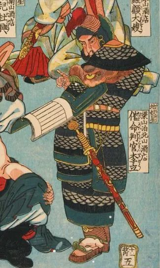 歌川国芳(1797-1861),江户末期浮世绘画家,在文政十年到弘化三年期间创作了大量水浒题材画作。例如,他在天保前期(约天保十四年)到弘化三年期间创作了《水浒传豪杰百八人》,此外,还创作了《水浒传豪杰百八人之一个》。《水浒传豪杰百八人》,每幅描绘九个英雄人物,每个英雄旁边有单独的榜题。虽然没有直接的文献记载,但从人物形象塑造上来看,陈洪绶对歌川国芳的影响颇多 。